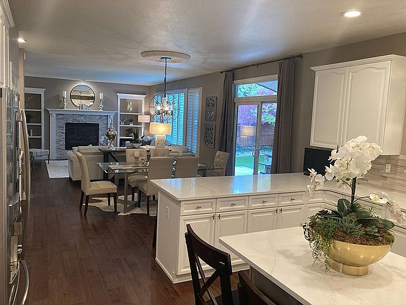 Covered outdoor living with cover over 3/4 of patio, stone pillars, tv, fireplace, built in grill, fridge, counter, 2 InfraTech electric heaters. Main level office with full bath and closet. Main level new wood flooring, upstairs all new carpet, new 5 inch trim throughout.