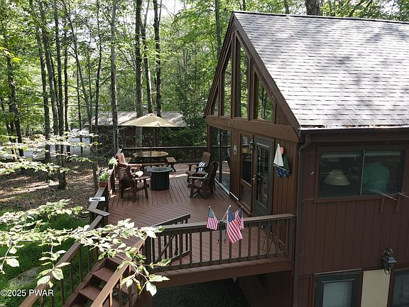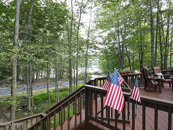 This water view chalet exudes rustic character and is located in one of Lake Wallenpaupack's finest recreational communities! This exceptional home offers water views of Deer Lake from the expansive entertaining deck and is steps away from Deer Beach. With 3 bedrooms plus loft and 2 full baths this home has room for the entire family. There is also room for expansion in the unfinished lower level. Central air and heat, rustic wood floors, custom wood accents, tongue and groove cathedral ceilings and a floor to ceiling wall of glass offering views of Deer Lake make this an exceptional choice for a lake home. The community's amenities include a marina with direct access to Lake Wallenpaupack, swimming area on Lake Wallenpaupack, central sewer and water, 2 outdoor pools, indoor pool, 2 private lakes, gym, tennis, pickleball and so much more. This is a must-see home with tons of charm and character that you will be proud to call your lake house!