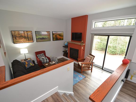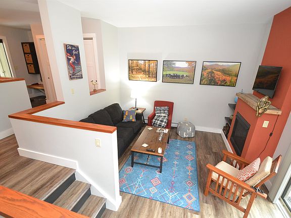 Stunning design and completely remodeled throughout! Just minutes from downtown Waitsfield, Sugarbush resort, hiking and biking trails and all the recreational opportunities available in the Mad River Valley. Stylish kitchen featuring quartz countertops, a deep oversized sink, and stainless steel appliances. A custom gas fireplace with a barn beam mantle is the highlight of the sunken living room and sliding doors allow direct access to the updated and enlarged back deck. Tons of natural light and new, multi directional window shades provide privacy for every window. The open floor plan imparts a sense of space unexpected in a unit of this size. Front hall closet modifications accommodate stacked laundry units for convenience, and ample coat storage. Two large bedrooms, one with 1/2 bath ensuite and both featuring good sized closets. Being sold tastefully furnished! Showings begin April 21