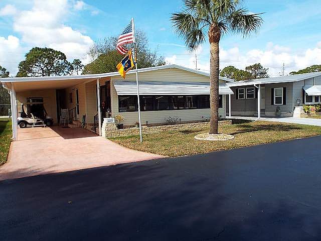 This 2 BR 2 BA updated home in active 55 plus park is on a perimeter lot. Extended carport, large shed and screen room in rear. Full front Florida Room perfect for entertaining or if you want to relax and enjoy. Large rooms, Walk In Closets, inside laundry, dining open to living room with built in hutch. Kitchen has beverage bar. Many upgraded features.