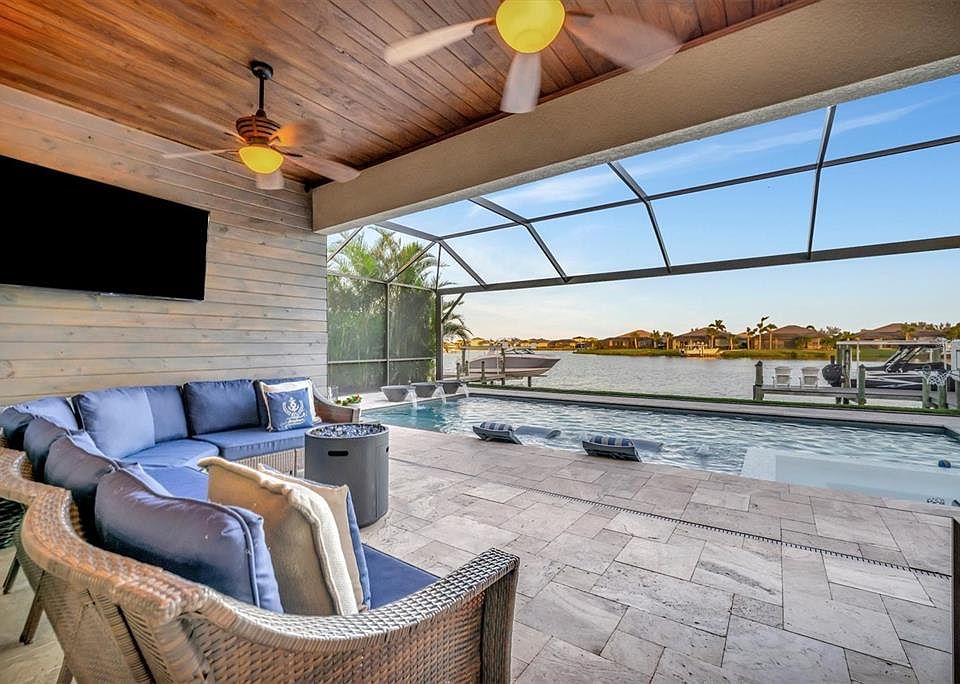 WATERFRONT 3 bed + Den 2 bath,2 car garage home with pool, spa and dock. This is a unique home layout that no one else has in the community. With a side entry 2-car garage built with widened brick paver entry. The elevated front covered porch has a beautiful daybed/swing to enjoy the sunset. On a cul-de-sac with a wide grassy area, lush landscape lighting and no sidewalk gives you room to enjoy outdoor activities with pets and grandchildren. Inside are updated grey engineered wood floors that flow through the entire home. As you enter, there is a large formal dining room with built-in shelving accent wall perfect for displaying decor or cherished items. To the left of the home is a large private flex room perfect for a 4th bedroom, office, or playroom currently used as a movie room with 120” projection screen. The open-concept living room has a breathtaking unobstructed view of the water with fully retractable tinted sliders. The kitchen is a perfect central gathering spot, with a large island, custom cabinets, quartz countertop, tiled backsplash, stainless steel appliances and a custom frosted glass pantry with upgraded shelving. Nearby is the mud room with washer and dryer, sink, storage closet & a Dutch door. The south side of the home has long hallway that shares bedroom 2 & 3 and a 2nd bath with dual vanities, tub and tilted mirrors providing a sense of privacy. The large living room has a custom accent wall and is a stunning focal point. The master suite overlooking the pool area and water view is spacious and even a king bed leaves lots of room, cedar accent wall, picture framed tv and tray ceiling, His and her walk-in closets and a large spa-like retreat master bath with sleek glass walk in shower, jetted jacuzzi tub, dual vanity with custom mirrors and lights, separate linen room and toilet room. The recently added pool finished in 2021 includes electric pool heater and gas heater for the spa, picturesque screen, cashmere travertine, custom cedar wall with large 65” tv on swivel so every seat in the pool area does not miss the big game, spa with an “infinity” spillway, large baja shelf with 3 bubblers and led lights, Spa & 2 pool led lights allow you to customize any colors on a easily controlled app, 3 large custom concrete bowls that provide constant waterfall & 3 bar stools that set up nicely with a drink on the spa shelf and watch tv, 500lb oval firepit, custom BBQ area with concrete countertop with Cal Flame 4 burner grill & refrigerator. Finally walk out the back door and directly onto your dock installed in 2014 has with Trex composite decking & a 10,000lb lift installed in 2015. Also plumbed in gas for grill and fire pit...never worry about propane tank again The extended large 2 car garage has an extended area for a lots of storage & swiss trax garage tiles. The home was recently painted and every room has upgraded lights and ceiling fans. Front porch and covered lanai have stained cedar ceilings, ceiling speakers wired throughout the house, front porch, and pool area so you can enjoy your music everywhere. Impact windows installed in front of the home. New AC system June 2021. HOA includes 24/7 manned guard gate, lawn care, cable and, internet. Tidewater Preserve has NO CDD. Amenities include a clubhouse with it's own full time event coordinator 2 Gyms, 3 community pool, tennis courts, marina, dog park, walking trail along the manatee river & kayak launch. Close to airport, beaches, shopping and restaurants.