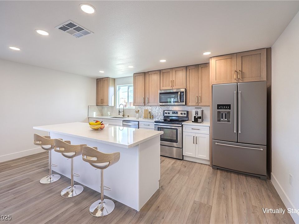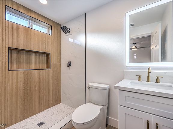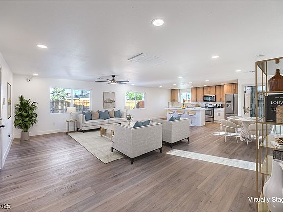 Fully modernized single story 3 bedroom home in the heart of central Las Vegas. Inside you'll find a neutral palette adorned by premium plank flooring following through out the common areas of the home while lush carpet extend into the bedrooms. Entertaining has never been easy with an open concept island style kitchen highlighted by two-tone rich wood soft close cabinets, gorgeous stone counters, and stainless steel appliances. Retreat to a primary suite paired with an ensuite providing a upgraded plumbing fixtures and custom tiled surrounds. Enjoy comfort and ease of living with upgraded windows and a new water heater. Fully fenced in yard allows opportunity for future greenery, gardening, or whatever your heart desires. Priced to sell, schedule your personal showing today!