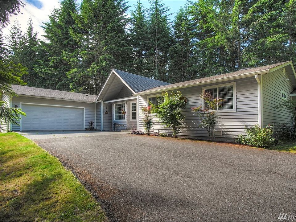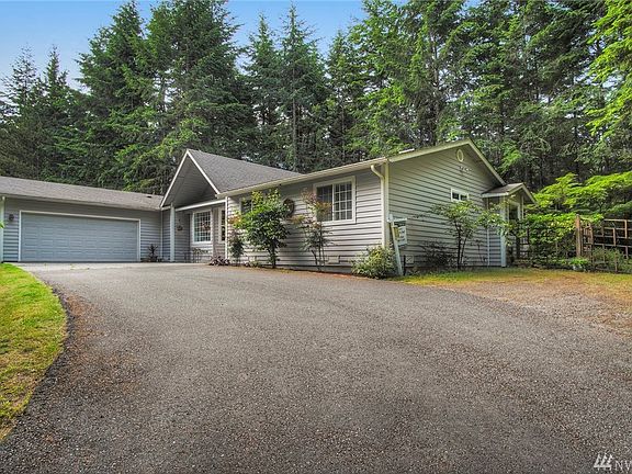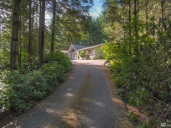 Private 1 level rambler on 2.38 acres. 3 bedroom, 2.25 baths. 1789 sqft. Craftsman style home with cathedral ceilings, maple floors, open great room - kitchen and family room, wood fireplace, skylights, heat pump/AC and private exposed aggregate patio. Paved driveway with gate.
