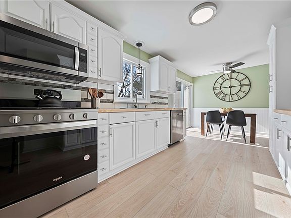 RARE FIND in Chili! This stunning 3-bedroom, 2-bath ranch in the highly sought-after Churchville-Chili School District is a true gem! Completely remodeled while maintaining its original charm, this home features refinished hardwood floors and luxury vinyl plank flooring for a perfect blend of classic and modern style. The brand-new kitchen is a showstopper, boasting stainless steel appliances, a coffee bar, subway tile backsplash, butcher block countertops, and recessed lighting. Both bathrooms have been fully renovated with today’s modern conveniences. This home is very deceiving in size. Enjoy endless possibilities in the finished basement, complete with a cozy wood-burning fireplace, plenty of storage, and a newer LG pedestal washer and dryer. This space is perfect for entertaining, a home office, or even an additional bedroom with a full bath! Major updates include a brand-new tear-off roof, new driveway, 200-amp service, high-efficiency furnace, central air, new sump pump, and a brand-new sewer line connecting the home to the street! The attached 2-car garage features a new garage door opener for added convenience. Step outside through the sliding glass doors and onto a huge deck with privacy fencing, overlooking a spacious .41-acre lot. Located in the heart of Chili, this home offers easy access to parks, shopping, dining, and top-rated schools. Walk to Chili Center and enjoy all the community has to offer! Don’t miss this incredible opportunity—homes like this don’t come around often! Schedule your showing today before it’s gone! Delayed Negotiations March 4, 3pm.