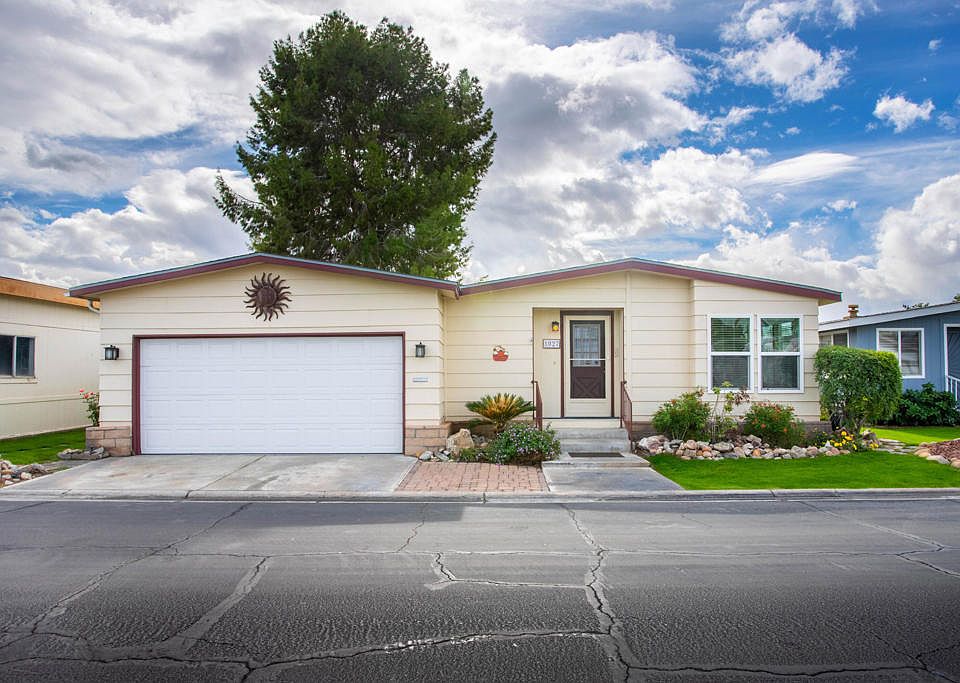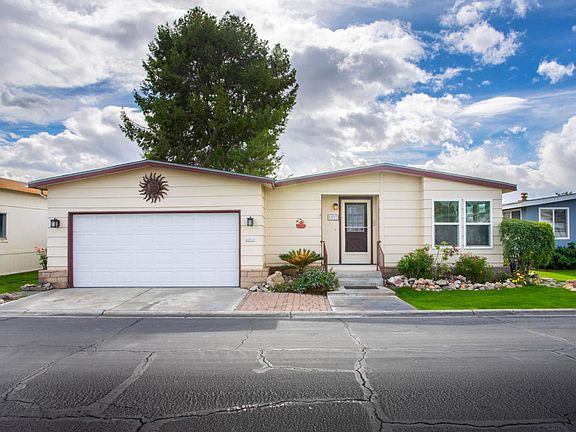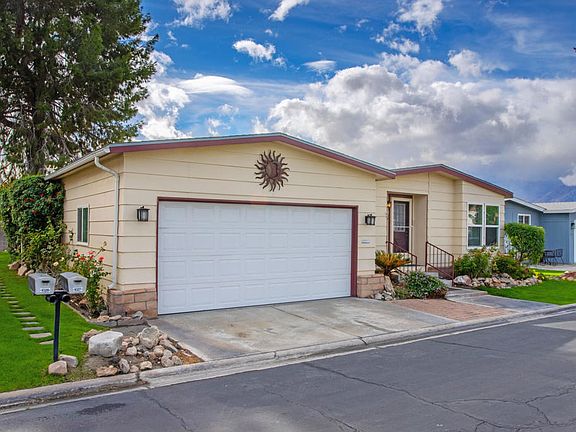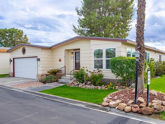 Fantastic opportunity to own in this prestigious senior gated community called desert sands. This is a good sized home with 1340 square feet of living space. Inside this home is drywalled and has laminate flooring throughout. Windows and doors are dual paned. Inside door are six paneled. Perfect location with no one behind except outstanding views of the southern and western mountains. This home comes with a galley kitchen, master bath with tub and shower, master walk-in closet, laundry room and a direct access two car garage. This home would be a great home away from home or a full time residence. Desert Sands has amenities including: Pool and Spa, Tennis, Clubhouse, Exercise room, Sauna, pool tables, and crafts room. This community looks like a regular tract of homes, all homes have two car garages. Space rent for new buyers is 925 per month.