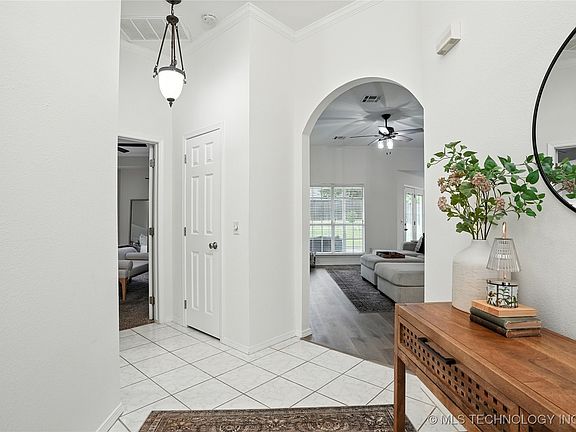 Move-in ready, well-maintained, tastefully updated single-story home situated on a corner lot in Jenks' Churchill Park. Side-entry garage and full-privacy fencing with a nice-sized yard. Functional split-bedroom floor plan is filled with natural light and neutral paint colors throughout. Low-maintenance, luxury vinyl plank flooring in the living room. Large, open kitchen with a center island, newer stainless steel appliances, an expansive breakfast bar and a nice sized dining nook. The spacious primary suite features trey ceilings and back patio access; ensuite bathroom with a corner whirlpool tub, double sinks, an updated tiled shower and walk-in closet. Mud/utility room with a storage closet and garage access. Fantastic Jenks location provides quick access to Hwy 75, the Creek Turnpike, and Downtown Jenks dining, retail and entertainment. Don't miss out on this turn-key home in desirable Jenks schools!