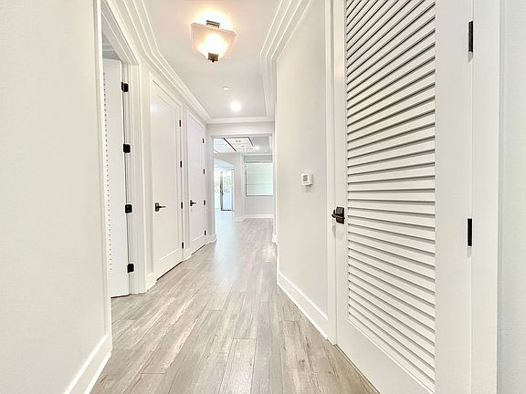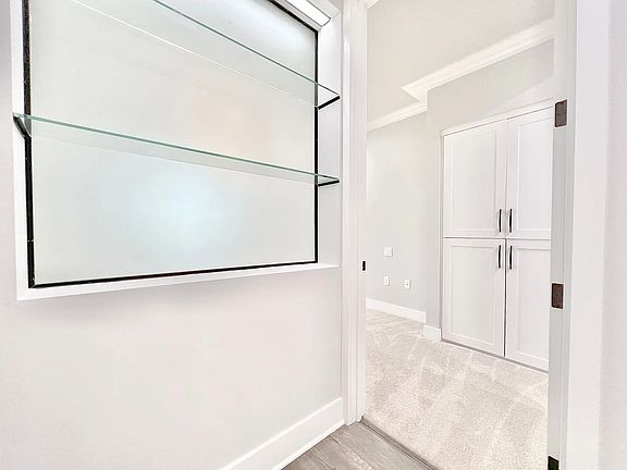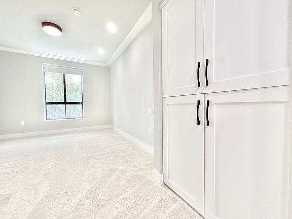 Modern bathroomModern tile flooringLarge modern kitchenLarge private patioGlass sliding doorsLarge unitCrown molding