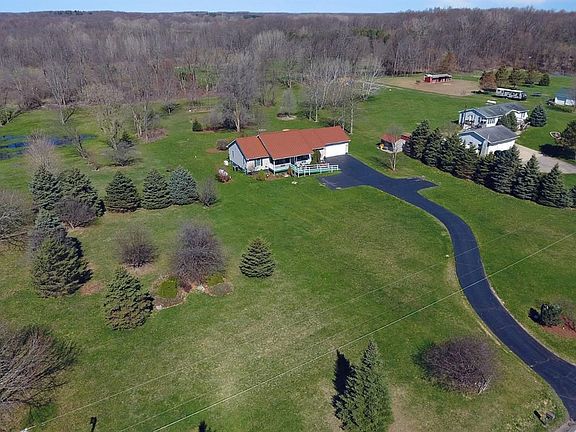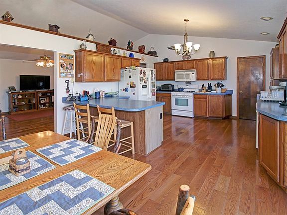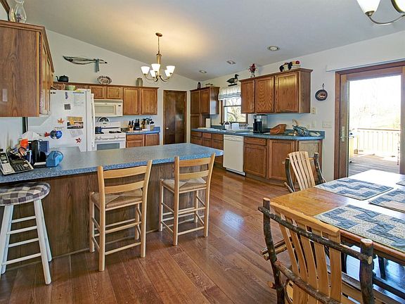 Great 3 bed/2 bath ranch on 2 country acres. Tile entry with hardwood floors throughout the large vaulted living, dining and kitchen. Combination oak kitchen and dining with snack bar, pantry and all appliances. Dining opens up to rear deck viewing the back yard with beautiful trees and landscape. Main floor master with hardwood floors, full tile bath, roll in shower, dual sinks, walk in closet and prvt deck access. 2 additional bedrooms share 2nd full bath along with convenient main floor laundry. Huge basement offers an open canvas to design and finish as you like with high ceilings and plenty of storage space. Deep 2 car garage is finished also. Enjoy the quiet country setting from either your front covered porch or rear deck in a park like setting!