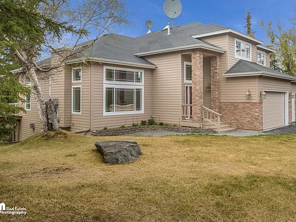 One of a kind, this majestic home is situated on almost 3.5 Acres with breathtaking views of the city, Denali and Inlet. This spacious home features three levels of luxury complete with 5 bedrooms, 3.75 baths, workout room, den & more! Sunlight streams onto the expansive cedar deck, ready for summer entertaining with fire pit & hot tub.Formal dining & living,circular driveway, lots of useful land.