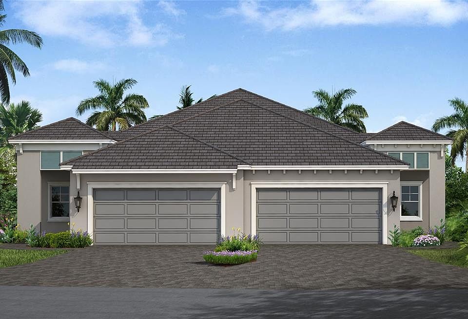 Under Construction. This stunning Tidewinds villa offers 1,638 square feet of thoughtfully designed living space, featuring 2 bedrooms, a versatile den, and 2 full baths. Every detail has been carefully curated to blend comfort, elegance, and modern style. Step inside to find 8-foot interior doors, coffered ceilings, and luxury vinyl flooring flowing seamlessly throughout. The spacious great room opens to your extended lanai through an 8-foot pocketed triple slider, creating the perfect indoor-outdoor living experience. Storage is never an issue with three linen closets, bedroom closets, and a walk-in kitchen pantry. Enjoy peace of mind with impact-resistant glass windows and a gas stub ready for your outdoor grill. The chef-inspired kitchen features soft-close, full-wood cabinetry in sleek off-gray tones, paired with bright white quartz countertops and a herringbone backsplash. Stainless steel appliances complete the upscale look. Make New Year 2026 special in this pristine villa — a perfect blend of comfort, style, and functionality.
