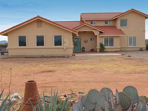 Peaceful location, on a paved road, and close to the Riparian Area. This Mediterranean style home was painted inside and out in 2017 and has had many other updates including granite countertops, flooring, lighting and appliances. There are two propane fireplaces, one in the Great Room and one in the Master bedroom, which also has a lovely sunroom, accessed through a sliding barn door, with views of the surrounding mountains! The office has a separate entrance and could easily be converted to a fourth bedroom with the addition of a closet. The acreage is fenced and cross-fenced for horses and has a horse shade built in 2017. Move-in ready! Come take a look!