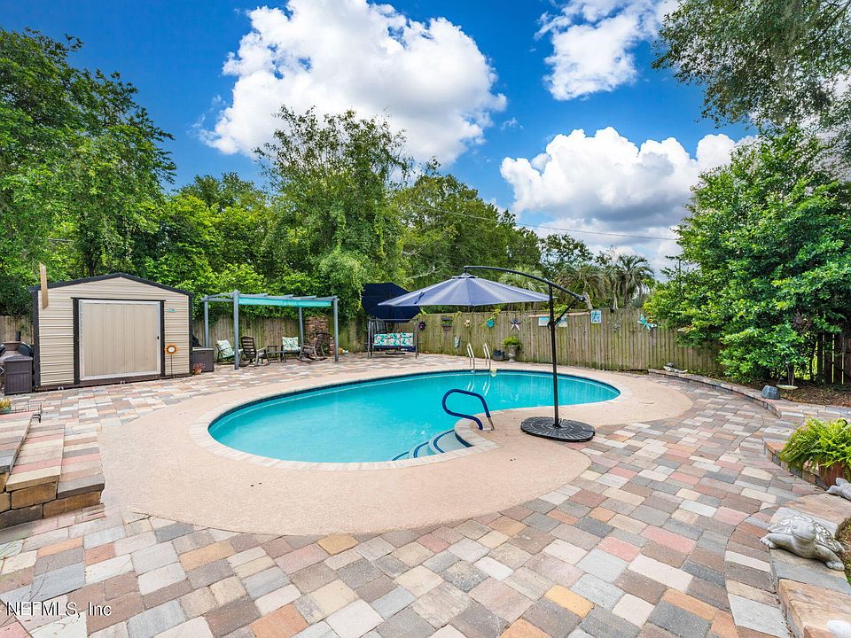 Mid-century modern POOL home with so many updates/improvements. Wood floors thruout, remodeled kitchen with new cabinets/granite countertops & recessed lighting. Updated baths, replaced many windows and doors throughout, new tankless water heater, updated electrical & roof only 3 yrs old! Recently added 2000 square feet of pavers around pool in back yard & front porch area. All new pool equipment plus new marcite & coping in pool. Two large detached storage sheds included as well. No HOA. Boat/RV parking is allowed. Large corner lot with new privacy fence in back, newer septic, drainfield, & updated plumbing. The lower level offer a bonus room w/cozy fireplace or 4th bedroom option with half bath. This home has easy access to the beaches, I-295 & the St. Johns Cty Town Center, Mayport Naval Base, downtown. Centrally located to all the shopping. See document tab for list of upgrades.