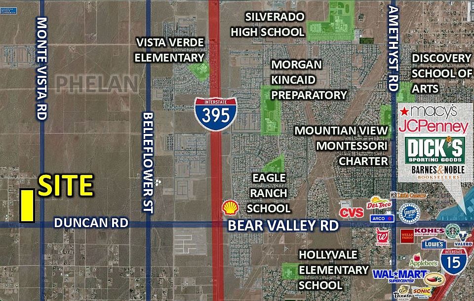 10 acres vacant corner land on Duncan Rd & Columbine Rd in Phelan, near the transition from Bear Valley Rd into Duncan Rd. Property is ideally situated just outside city limits, near Silverado High School, Vista Verde Elementary School & Discovery School of Arts, perfect for future residential home development. Less than 2.5 miles from Highway 395 & less than a 10 minute drive to the I-15 Freeway, this becomes an excellent location for commuters. Location is near the Village Shopping Center featuring Stater Brothers & Little Caesars, as well as near Rite Aid & CVS. Close by is the Mall of Victor Valley featuring brand new anchor tenants Macy's & Dick's Sporting Goods. Convenient access to the new Walmart Supercenter & Restaurant Row on Amargosa Road, including Red Lobster, Olive Garden, Outback Steakhouse, Chili's, Apple Bee's, Johnny Carino's, Freddy's Steakburgers & more. Subject parcel is zoned Single Family Residential allowing for 1 unit/acre.