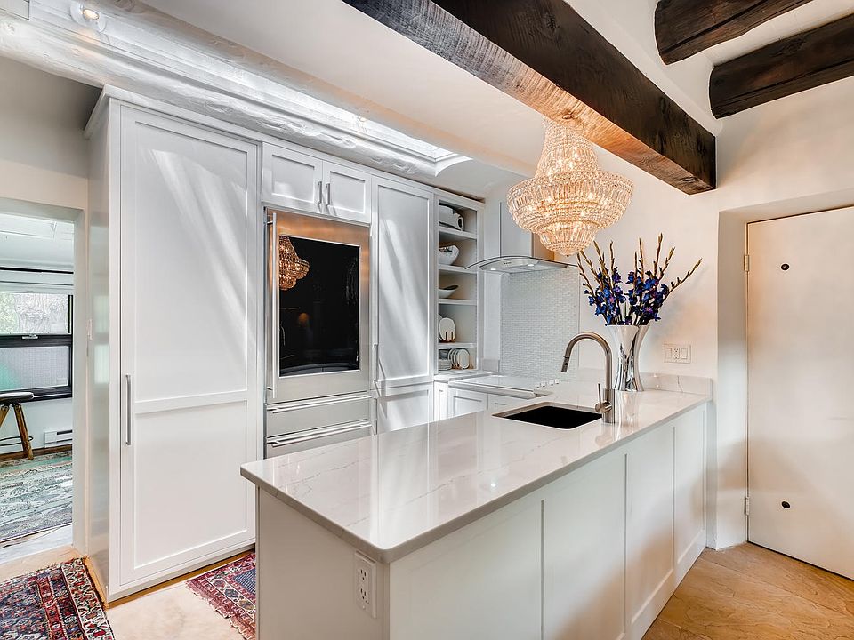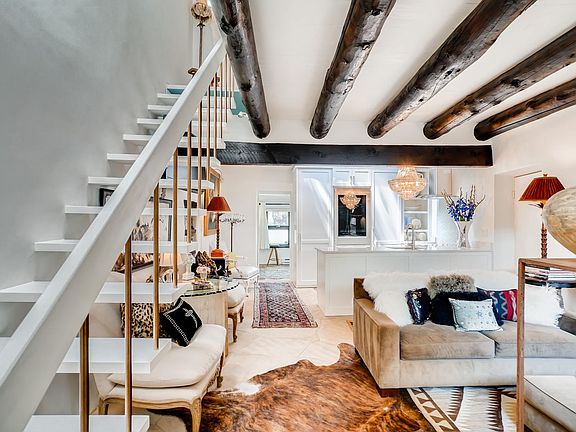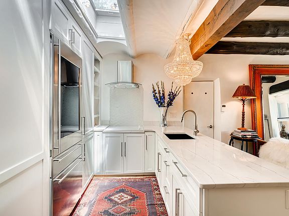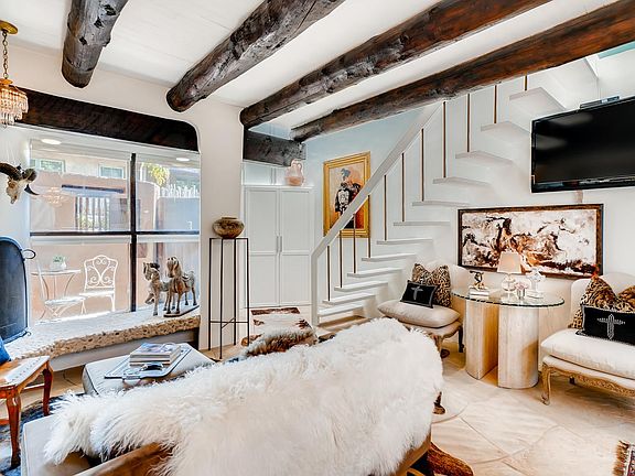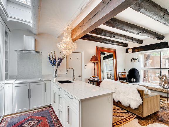 Award winning Jeff Harnar architecturally designed property on Historic Canyon Road! East side elegance is found when entering through the wood gate which leads into the flagstone courtyard. This authentic adobe/frame stucco classic blends old world charm craftsmanship with contemporary modern comforts. Flagstone flooring throughout with wood flooring in the bedroom. Large southern facing windows in living room with abundant skylights throughout the residence surround the corner kiva fireplace. Reclaimed wood built-in bookcase. Stone counters in kitchen and bath. Bosch washer/dryer. GE Monogram glass front refrigerator. Hidden coffee/wine bar. Coved ceiling with vigas in kitchen/dinning. Large vigas flank the high living room ceiling for cozy evenings looking out to the private front patio. Roof top deck with kiva fireplace makes outdoor entertaining under the stars exceptionally dreamy. Through the splayed adobe entrance leads you into the bedroom retreat with an electric remote wall fireplace and a carefully designed closet system with abundant space. The bright sunny designer bathroom has high ceiling with vigas and well thought out storage to include an electric wall fireplace. No interior steps except to roof top entertainment. Near fine dinning, coffee bars, galleries and boutique shopping. Enjoy the ease of the historic Patrick Smith Park behind this residence that is carefully manicured for beautiful views. Pre-Inspected with ALL repairs addressed.