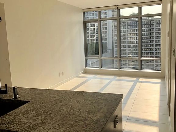 This contemporary 1BR & flex unit on the 14th floor comes with A/C & features an open layout with the kitchen overlooking the living and dining area. against the backdrop of downtown Vancouver, visible through the floor-to-ceiling windows. The kitchen comes with Miele appliances, spacious marble countertops & a large kitchen island perfect for entertaining friends and family. Ensuite bathroom features radiant floor heating and a large soaker tub.