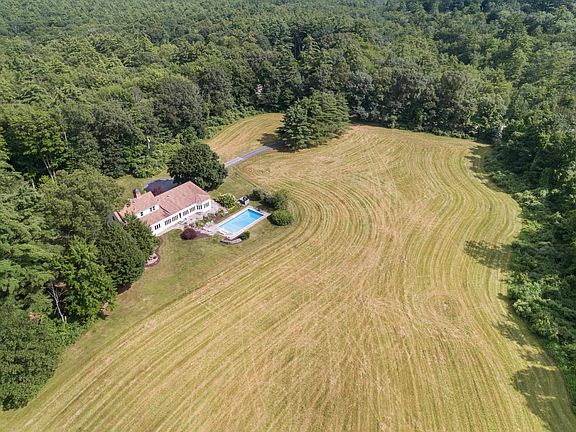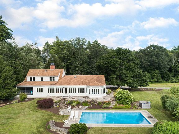 Sited away from the road down a paved drive is 8.5 acres of fields, woods and a contemporary cape thoughtfully situated to take full advantage of the natural surroundings. Underground utilities. The large living room has a ceiling of hand-hewn beams w/ a large brick fireplace as a central focal point, it is open to the eat in kitchen w/ butcher block counters & wet bar, new ice maker. The Family Room & Office has a wall of bookshelves, counters & cabinets for your library & storage. These rooms open to an atrium w/ vaulted ceiling & wall of windows overlooking the acreage & beautifully maintained inground pool. Wide pine flooring recently refinished throughout part of the house. The Dining Room has a stunning brick fireplace w/substantial mantle. 3 season hexagon shaped sunroom brings the outside in w/ surrounding windows & high ceiling. Primary ensuite located on the first floor has a generously sized walk in closet. Step out onto the 3 seasoned porch and take a dip in the hot tub! Two more large bedrooms & full bath upstairs. Wonderful amenity is the house generator. Two car attached garage. In ground gunite pool. It is ultimately private w/ some natural rock landscaping. A beautiful habitat to enjoy during all seasons in the lovely town of Hopkinton!