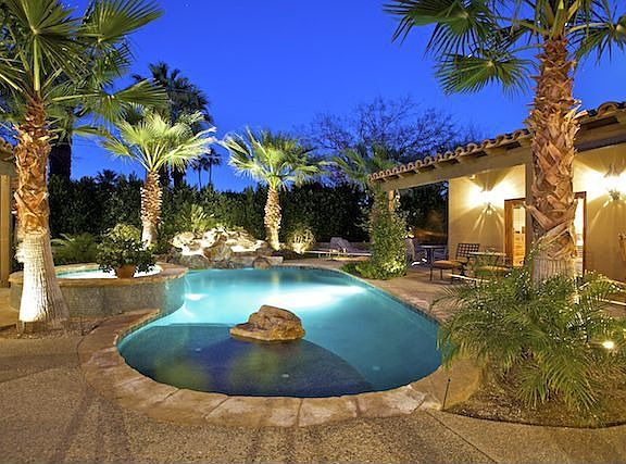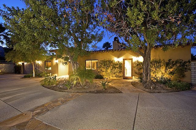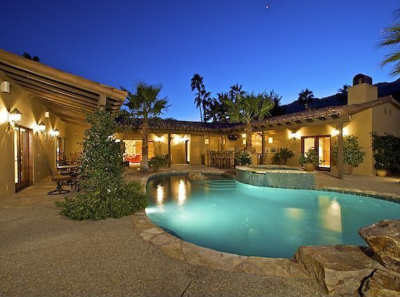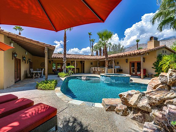PRICE IMPROVEMENT! Located in Movie Colony East and next to Ruth Hardy Park you'll find this tastefully upgraded 1934 Spanish Hacienda. Impressive curb appeal and circular driveway / carpark greet you to this beauty. Some inside features are Bulgarian limestone flooring, Alder wood doors, open beam ceiling, rod iron accented windows, and fireplace. Chef's kitchen features custom cabinets, granite countertops, 6 burner Viking cook top, wine cooler, walk-in pantry and overlooks the dining / family room. Split floor plan with bedroom / bath adjacent to family room then the generous sized master bedroom with ensuite bath and 2nd fireplace looking out to pool, additional bedroom / bath, and full laundry room on opposite side of home. Through various French doors a free form Pebble Tec, salt water pool with elevated spa and accented by a massive rock waterfall, full outdoor kitchen, multiple seating areas, mature landscaping and stunning view of the San Jacinto Mountains complete this home.