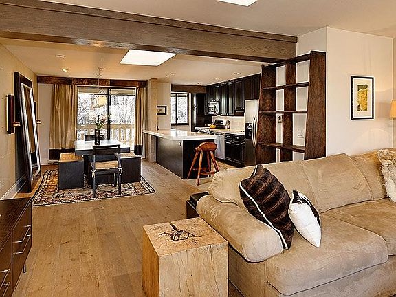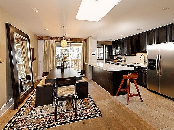 Beautifully renovated two bedroom, two bath featuring chic mountain-contemporary finishes and furnishings. Spacious living room with wood-burning fireplace, and two adjoining spacious decks facing Aspen Mountain & Overlooking the river. Gourmet Kitchen with stainless steel appliances and breakfast bar. Contemporary dining room with seating for 6 plus Two elegantly furnished bedrooms with beautiful river views and gracefully appointed private bathrooms. Ideally located just a short walk to the Gondola and downtown Aspen.