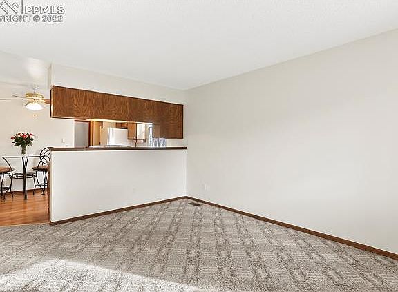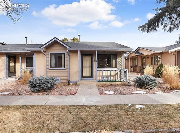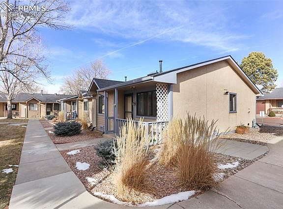 This is just the sweetest 55 and over small community of 25 units. There are social functions, seasonal parties, and a community that watches over each other. This end unit townhouse was freshly painted, professionally cleaned, and carpets cleaned. The location is convenient to the Powers Corridor and Academy Blvd. The front of the townhouse has a quiet covered patio and around the side is a space for a patio table, chairs, and a grill. The kitchen has a nice window over the sink, a solar tube skylight, a pantry, and all appliances stay. Laundry in the hallway near the backdoor has a stacked washer and dryer that stay. The primary bedroom is quite large with a big closet and a private 3/4 bathroom with a step-in shower and a handle for stability. The full bathroom has a linen closet and a fun hand dryer which is nice when your hands are cold. The living room can easily hold a couch, two recliners, TV console table/entertainment stand, and end tables. There is air conditioning and ceiling fans to keep you cool and natural gas furnace to keep you warm. You have amazing storage space in the crawlspace that you can get to off of the living room in the coat closet. The crawlspace is over 750 sq ft and where the furnace and water heater are located (picture included). It is quiet and peaceful, a convenient location, and neighborly.