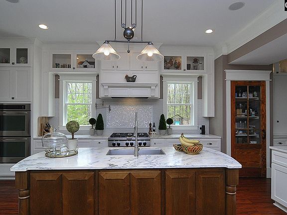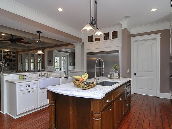 - Kitchen: Bar, Island, Floors-Hardwood, Backsplash-Tiled, Cabinets-Painted, Recessed Lights, Prep Sink, Countertops-Marble