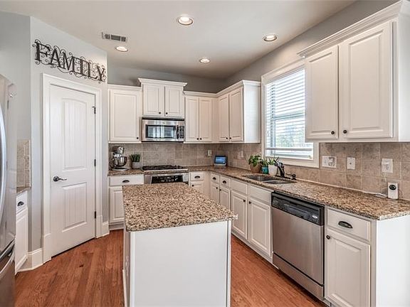 - Kitchen Features: Cabinets Stain, Eat-in Kitchen, Pantry, View to Family Room, Stone Counters, Kitchen Island, Pantry Walk-In, Breakfast Room