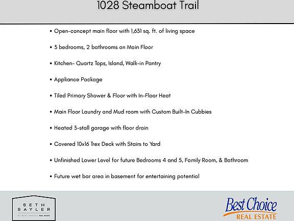 This Stunning 3-Bedroom, 2-Bath Home by BK Home Builders offers 1,631 sq. ft. on the Main Level with Quality Finishes Throughout and an Unfinished Lower Level. The Main Floor hosts a Spacious Kitchen with Quartz Tops, Walk-in Pantry, Island and Stylish Touches. Enjoy the Main Floor Laundry Room and Mud Room with Built-in Cubbies. The Primary Bedroom features a Large Walk-in Closet and Primary Bath with Heated Tile Floors and Shower! The Oversized Heated 3-Stall Garage with Floor Drain is perfect for all seasons, while the Covered Deck and Front Porch provide great outdoor living. The Unfinished Lower Level offers room for 2 more Bedrooms, Living Room, a Bath, and a Future Wet Bar, giving you plenty of space to grow. An Appliance Package is included, too!