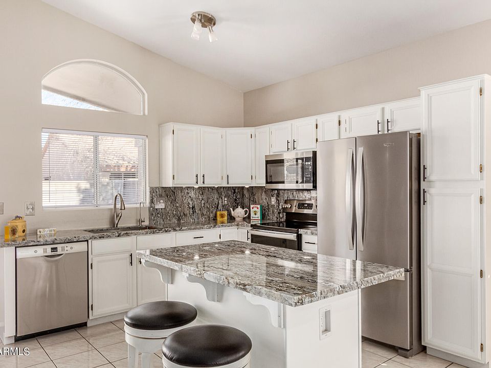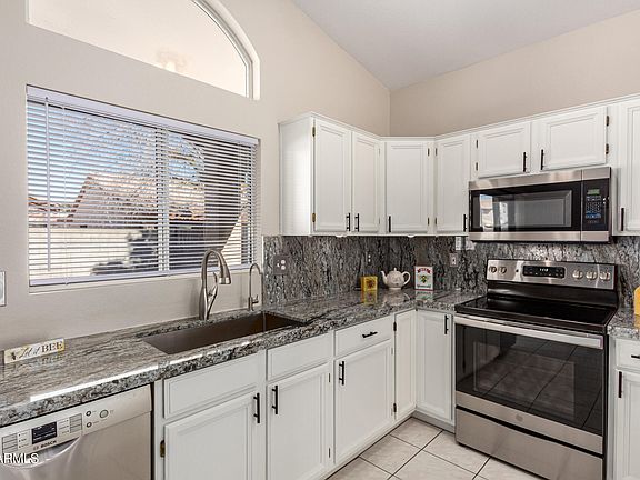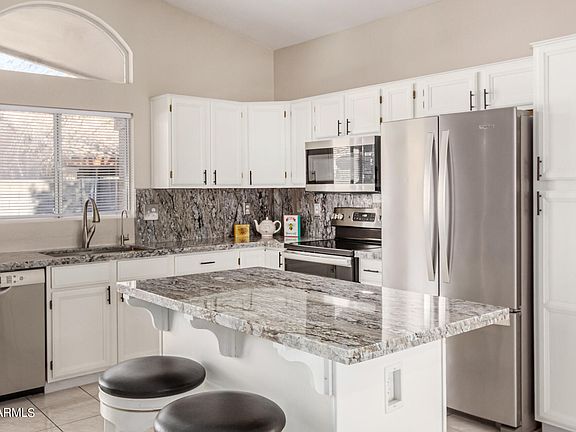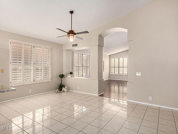 Looking for a new place to call home? This charming 3-bedroom home with a den in Chandler is now on the market! Explore inside to discover a perfectly flowing layout showcasing gleaming wood-look floor, arched doorways, plantation shutters, striking vaulted ceilings, & soothing palette throughout. The kitchen boasts white cabinetry, sleek granite counters, stainless steel appliances, track lighting, & a center island complete with a breakfast bar. Double doors open to the main bedroom, offering a private bathroom with granite dual sinks & a walk-in shower . You will find a fantastic backyard featuring a covered patio & easy-care landscape! What's not to like? This value won't disappoint!