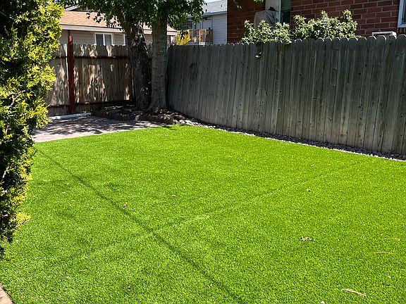 Fully fenced newly renovated landscaped yard with pet friendly artificial grass.