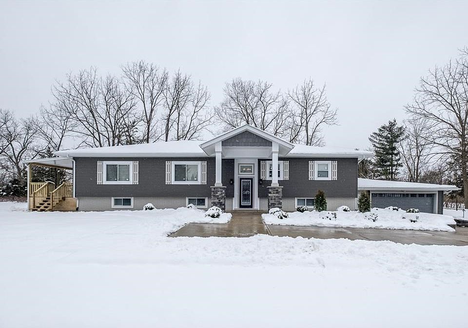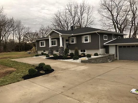Sitting on one acre this large 4300'+. home features beautiful open concept living room, dining room and kitchen. The living room features large windows bringing immense natural lighting and a beautiful stone wood-burning fireplace. The soft gray color palette with white trim throughout home is enhances the homes beauty. All four bedrooms are on the main floor which includes a large master suite and private master bath boasts separate luxury bath, large walk-in shower and double sink. In addition, a private office is perfect for school studies or home office. The lower level again boasts an open concept design including family room, wet bar, half bath and a recreational area. Finally the combined storage room and utility area provides ample area for storage of seasonal items. Updates include, new roof, windows, siding, insulation, entry door, flooring throughout, new kitchen, baths, well pump, water softener, wet bar, front facade, driveway & sidewalks, retaining wall and landscaping.