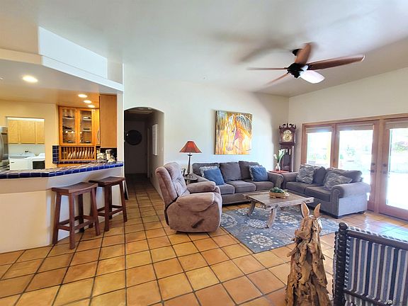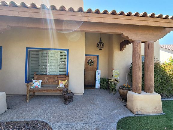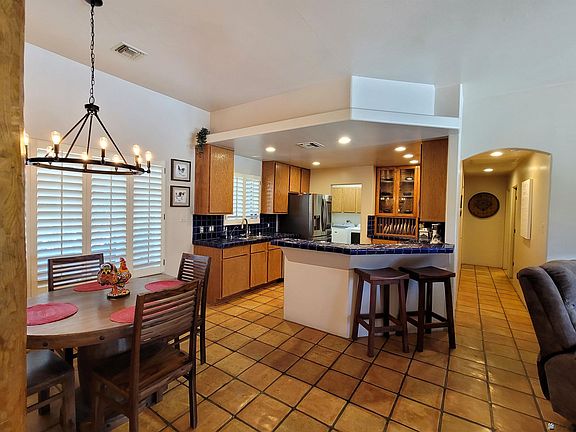 Golf course views in the back, and mountain views in the front, this beautifully kept Santa Fe home is an amazing oasis of peace and tranquility. It offers 3bdrms/2ba, vaulted ceilings, Saltillo tile throughout, and indigo blue tile with natural tone wood, ties in this Southwest style. The large glass doors in the living room and the primary bedroom allow so much light in, that the outdoors and indoors converge seamlessly. For the buyer that has toys, South side of the house has a large double gate with 30AMP RV hook-up, and RV-sewer connection. Easily fits a 40' RV. Newer A/C installed end of 2023, a high efficiency pool pump was also installed, and pool was resurfaced 2018. Don't wait call today for your showing appointment.