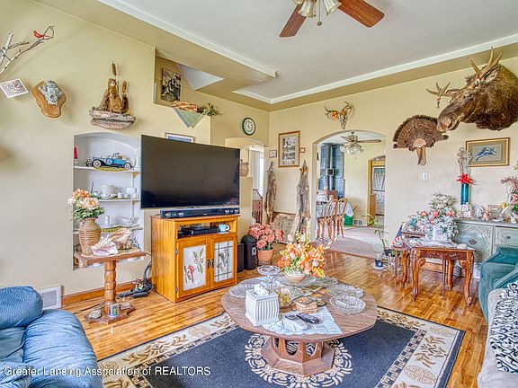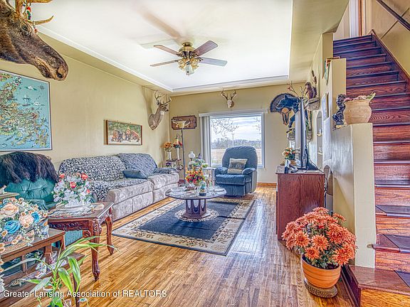 Oversized four bedroom (additional farmhouse room could be used as a fifth bedroom) 2 full bath 1918 farmhouse nestled on just over one acre. This home has it all; hardwood floors, formal dining room, den, first floor master, first floor laundry, wood burning stove, a huge sauna and a great space for a man cave! The property includes a grain feed barn with a covered concrete floor carport. The property does not include the lager barn to the west of the grain feed barn. Deep freezer reserved.