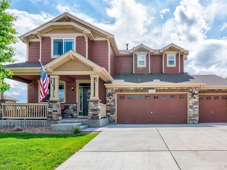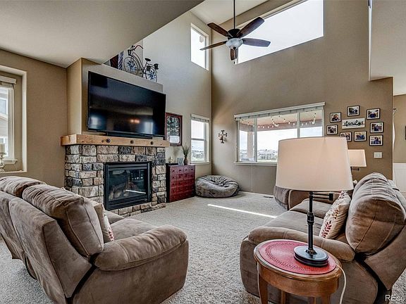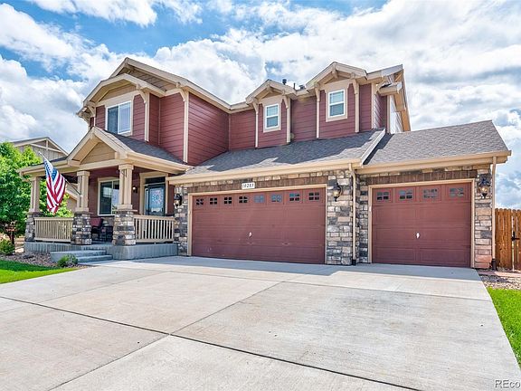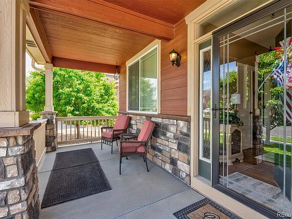 This home exudes pride of ownership! Immaculate, move-in ready 3 bed, 3 bath home with 3-car garage in popluar Buckley Ranch. Charming front porch, gorgeous hardwoods, new upgraded carpet and warm, neutral colors welcome you to this bright and open home. Main floor office just off the front entry has double doors and tons of natural light. You will find a gourmet kitchen complete with gas cooktop, double oven, granite counters, pantry and an island that opens to a lovely dining room and spacious living room with soaring ceilings and cozy gas fireplace. Built-in desk area with terrific storage just off the kitchen is a great convenient office space. The second level is highlighted by a large primary bedroom with en suite bath featuring a jetted tub and huge walk-in closet. Two roomy secondary bedrooms share a full bath and you will love the upper laundry room with tons of storage. A full, unfinished WALK-OUT basement is just waiting for your personal touch with the opportunity to add ample living space. The location is the STAR OF THE SHOW, with expansive mountain views and the peace and serenity of your backyard overlooking open space. Enjoy quiet evenings and the sunset from one of two great outdoor areas, a lower patio or elevated deck off the dining space. Fully landscaped and meticulously maintained, you don't want to miss this home with a rare ideal location. Just steps from a fantastic park and convenient to dining, shopping, golf course, rec center, DIA and so much more!