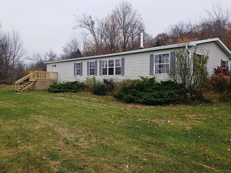 Selling below full market value. This 3-bedroom/2-bath manufactured ranch is located on a 11.9 acre country setting. It features eat-in kitchen; 12 x 24 family room with wood-burning stove; 14 x 17 living room with wood-burning stove; master bedroom with master bath with large tub and walk-in shower; main-floor laundry; Superior basement with 8' ceilings and studded walls ready to be finished; new roof, gutters and front deck; covered back deck; detached 24 x 32 two-car garage with side covered storage area; approximately 9.5 acres are wooded. Seller will give a $4,000 carpet allowance at closing. Call soon.