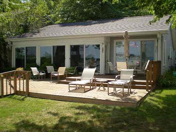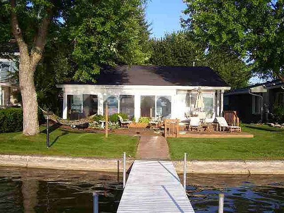 GREAT VALUE! WAWASEE LAKEFRONT HOME and a channel front lot too. 5 bedrooms, 4 baths in this lakefront home. Open living, dining, kitchen areas facing the lake as well as a 4 season room that you will love. Large lakeside deck (24 x 24) to enjoy morning sunrises and the lake activities. Move in ready with lots of updates as well as all the furnishings. Buildable back lot on the channel for a garage/guesthouse or extra parking as well as an additional pier for keeping your lake toys on quiet waters.