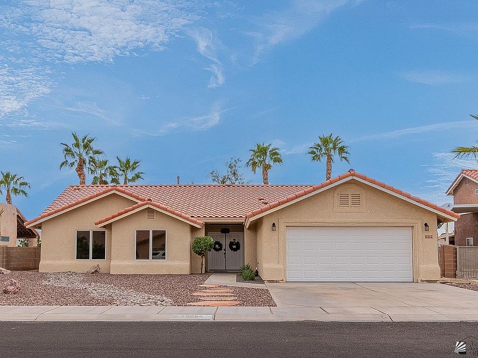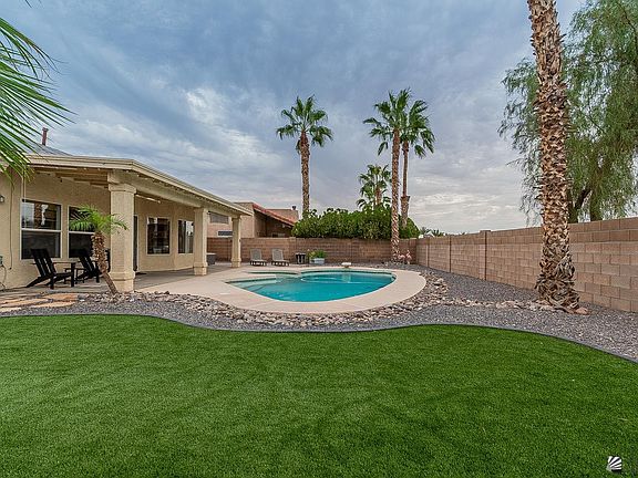 Beautifully updated 3-bedroom, 2-bath home located in the highly desirable Mountain Shadows at Mesa Del Sol subdivision! This spacious home sits on an oversized lot and features vaulted ceilings, granite countertops, an open concept kitchen with island, built-in desk, gas range, and plenty of storage space. Enjoy double front entry doors, "wood-like" tile flooring in main areas, fresh interior paint and baseboards throughout (2023), a dual vanity and newer shower door (2025) in the primary bath. Outside, relax under the covered patio or take a dip in the sparkling heated pool and spa. Recent upgrades include newer kitchen refrigerator (2024), washer (2023), kitchen sink (2025), pool heater (2023), updated lighting/fans in kids bedrooms, epoxy flooring in garage (2023), and all new rock and turf landscaping (2025). Mature palm trees add to the home’s curb appeal—move-in ready and perfect for entertaining!
