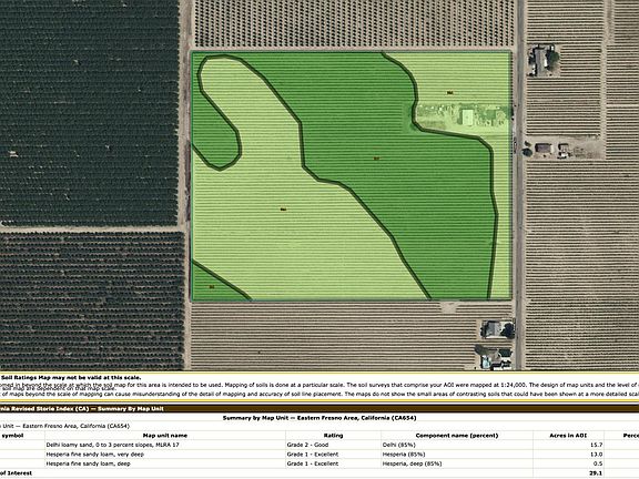29.32 +/- acres of Thompson Vines with predominately metal posts and crossarms. Vineyard is on recently installed drip irrigation with dual filter setup, Turbine Motor stamped 15hp. Subject property in CID district, but is not currently set up to use district water. Property includes a 2 bedroom and 1 bathroom house that is currently being rented, please do not disturb tenants. 40x60 Metal Shop to help keep your tractors and toys nice! Great soils suitable for numerous other crops.