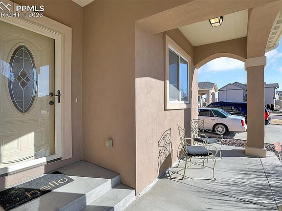 Take a look at this stunning Hudson model by Windsor Ridge in popular Lorson Ranch! Home has energy saving stucco ext., covered front porch entry, and locking storm door that leads to tiled entry. Bonus room has French doors and can be used as a bedroom, office, or formal dining room! Upstairs, the primary suite also has French doors & a ceiling fan. Additionally, upstairs, you will find bedrooms 2 & 3, which boast huge closets & 6 panel doors throughout, along with a great loft! Large tiled laundry room includes custom storage shelving. All 2.5 baths have upgrades including raised height vanities, granite counters, brushed nickel fixtures, & raised panel cabinet faces! 5 piece ensuite features upgraded dual square sinks w/ decorative rim. Shower features ceramic tile & custom accent tile. Ensuite includes 42" x 60" soaking tub, toilet closet & large walk in closet! Great room offers upgrades including a gas fireplace, ceiling fan, & hand scraped hardwood floors. Kitchen has stainless steel appliances, over-the-stove microwave, wine fridge, custom pantry, island, 42" cabinets w/ crown molding & raised panel cabinet faces, & timeless granite counter tops! Walk out to your beautiful back yard featuring a stamped concrete patio with permitted pergola and sprinkler system for those green-grass summer cookouts! The backyard has views of Pikes Peak, perfect for those quiet coffee breaks! Unfinished basement leaves room to grow with a bathroom rough in, or you can use it for storage space, or space for a home gym! Home also has a water softener system. The super clean, finished 3 car tandem garage has a 220 volt outlet for charging your electric vehicles, and the tandem is extra long for you to truly fit 2 cars! We can't wait to welcome you to your new home!