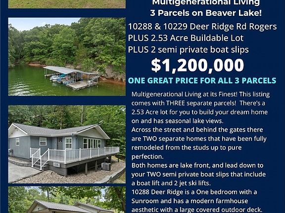 One great price for all three parcels on Beaver Lake! In this package deal, you will receive a 2.53 acre buildable lot with a seasonal lake view to build your dream home. Right across the street and behind the gated entrance, there are 2 separate homes that have been remodeled from the studs up and tastefully executed. Both homes are lake front, and lead down to your TWO boat slips that include a boat lift and 2 jet ski lifts. 10288 Deer Ridge is a One bedroom with a Sunroom and has a modern farmhouse aesthetic. 10229 Deer Ridge offers 3 bedrooms and 2 baths with a cabin chic aesthetic. These are perfect to own for vacation homes or have a multigenerational living situation. Gorgeous seasonal views of Beaver Lake and a quick 5 minute boat ride to Prairie Creek. Easy walk down to the lake. Get in touch today for your private showing.