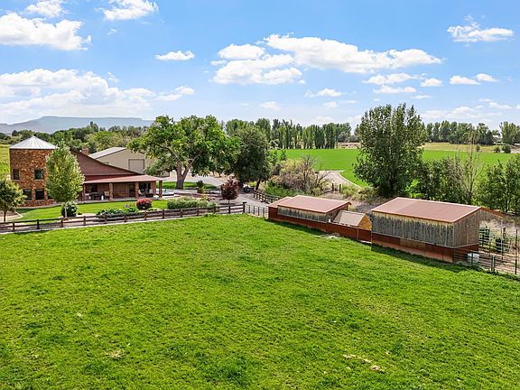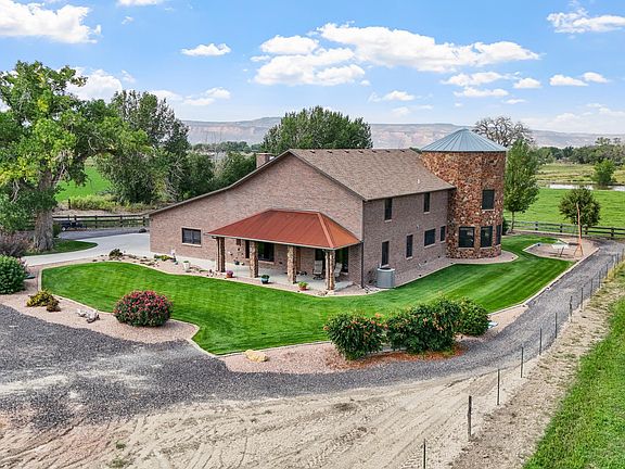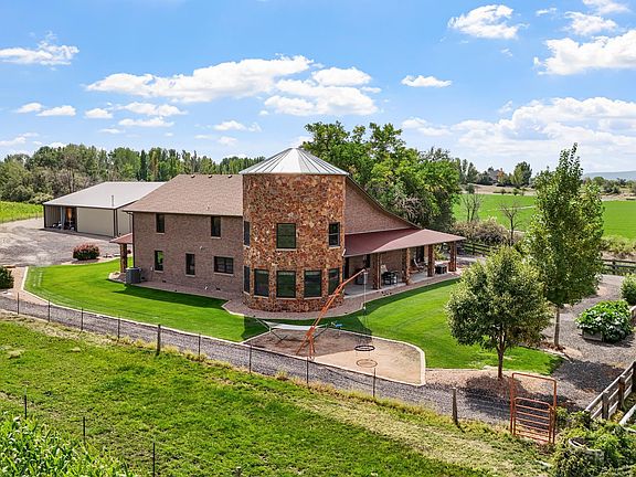 Privacy, Views & Versatility on 7.6 Acres A rare combination of rustic elegance and modern efficiency, this nearly 3,800 sq. ft. custom brick home sits on 7.6 acres w/sweeping mountain views. Designed by the original owner/builder this one owner home is both energy-smart and low-maintenance with a complete 10 kWh solar panel system, 2" foam + blown insulation, Jeld-Wen low-E windows with blinds, in-floor heat, air conditioning (not swamp cooler), and thoughtful custom finishes throughout. Property Features Land & Water: 7 Irrigated acres, pond, productive hay pasture (currently in corn), fenced grazing area, manicured yard, raised garden beds, fruit trees with 12 zone sprinkler system to all vegetation. Irrigation piping to remain with the property making this a move-in property. Farm & Animal Facilities: Run-in barn offers clever easy clean removable panels to clean, deluxe chicken coop with run and easy access egg collection, dog pen with protected dog kennel area, tack room with power, cattle guard and fencing and gates fully set up for cattle, horses, chickens, & dogs. Outdoor Living: Drive in on asphalt driveway, two covered porches, mature shade trees, privacy and quiet in this North Area of Grand Junction with just 10 minutes to shopping. Breathtaking mountain views and sunsets. Workshop & Indoor RV Storage 66’ x 80’ Heated & Cooled Workshop with 21' ceilings 220 power, reinforced floors, R25 walls & R30 roof Divided workspaces, Workshop and RV storage bay areas (12’ & 14’ doors) Some shelving and bike rack included Exterior covered storage for equipment and firewood Home Highlights: Open Concept Living Dramatic vaulted 17’ ceilings, cedar-mantle,new wood-burning stove with custom wood storage closet, central vac, and custom lighting. Chef’s Kitchen: Quartz counters, rustic hickory cabinetry with tall uppers , custom eat-in island, large double convection ovens, gas cooktop, high-end fridge/freezer, pantry, appliance garages, and deluxe water purification system. Primary Suite: Split design from main living areas with spa-like bath, double-entry shower, cedar-lined walk-in closet, private access to covered porch, and 14’ swim spa (included), plus a 8x8 bonus safe room. Bonus Loft: Custom barn wood feature wall and loft area—perfect for displaying treasures, collectibles, or personal hobbies.Additional Loft Space: Large Bunk room + crafting area (craft table & hutch included)stone-detailed turret ideal for office, gym, library or kids playroom.