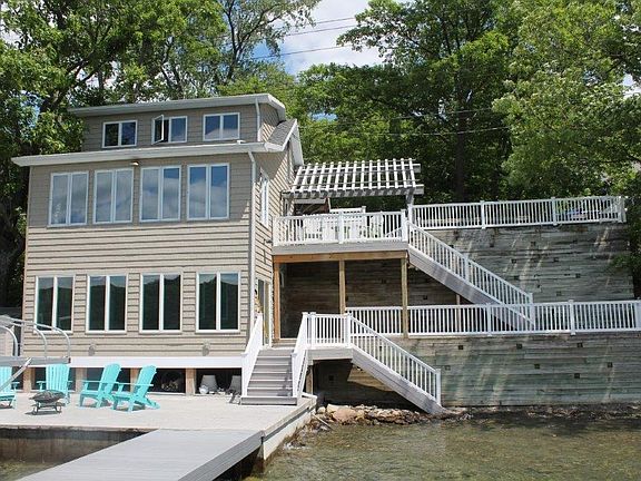 HUGE PRICE REPOSITIONING. Appraised at $612,000. Enjoy Summer with the Best Buy on Keuka Lake. Over $300,000 in Upgrades! FULLY FURNISHED Ready to Enjoy-just bring your bathing suit and flip flops. On Lake Side of the Rd-129' Lake Frontage. Shows like a Model Home & Views Like a Cruise Ship. Upscale Neighborhood- views of the Bluff. Easy Upkeep! Renovations inc Perm. Dock, Stamped Concrete Patios, Concrete Break wall, Vinyl Siding; Gutted/Renovated First Level in 2015; Gutted/Renovated 2nd & 3rd Level; Roof & Electric Service in 2005; New Septic/Leach Field in 2004; Blacktop Parking Area paved-Fall 2016; Includes Boat Lift & 2 Jet Ski Lifts. Lot incs wooded area between E Lake Rd/Rt 54 ideal for possible garage/parking/lawn/play area