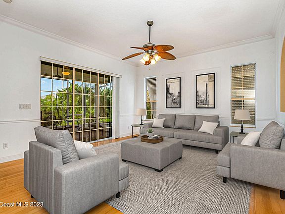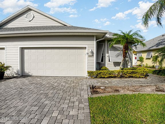 SINGLE -LEVEL OASIS in a GATED Key West- Style Village. Leave the stairs behind - this single story gem caters to relaxed comfort , perfect for those seeking island peacefulness . Unwind on the screened patio , shaded by breeze -rustling screens, as the day surrenders to starry night. Life moves effortlessly on this one level , from whipping up a Key lime pie in the upgraded kitchen to soaking in your Jacuzzi tub - all within reach . Crown moldings - light wood wood floors whisper island elegance , while custom barn door add a touch of quirky Key West personalty . Granite countertops and stainless steel appliances gleam in the sun , stone back splash adds rustic feel . Master suite heaven offers quiet space with large master bathroom suite . Dining area blends with open floor plan to gathering with friend and family . NEW ROOF 2023 / NEW AC 2023 / Central vacuum / Bahama shutters . Steps away community pool . 2 car garage .