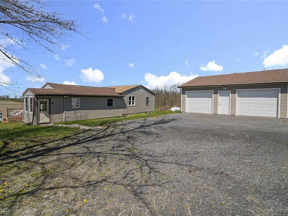 Welcome Home! Hardwood floors greet you, as enter a combo kitchen and living room, perfect for entertaining or watching the game! Enjoy your primary living space with a spacious open concept feel on the main level, adjacent to the privacy of 3 main floor Bedrooms, and 1 and a half Baths. Full open basement with laundry, storage and bar area ready for you to finish if you desire. Great space in the oversized, detached two car garage, for all your projects and tools. Enjoy sun filled evenings on the expansive back deck and summers in the above ground pool. Level and spacious 5.9 acre level grassy yard. Close to several marinas, 8 minutes to Aurora, 20 minutes to Auburn. Offers reviewed 5/1 @ 5pm.