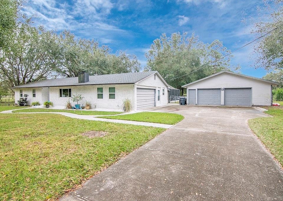 Country living at it's finest! Bring your horses, ATV, RV or boat to this beautifully updated pool home sitting on 2 acres in a well established neighborhood - with plenty of space between neighbors. There is no HOA nor CDD. Could qualify for USDA financing. Modern open floor plan. Kitchen with granite counter tops, white cabinetry, island and stainless steel appliances. Great room features a wood burning fireplace. Practical plank tile floors throughout the home. The sun-filled Florida room is perfect for an office or you could simply use as a secondary living room. The master bathroom features an antique vanity with dual sinks. Screened in pool and deck with covered back patio. The exterior was recently painted. If you are a car enthusiast, bring your car collection as this home features an attached 2 car garage (17'x23') and a detached 4 car garage (tandem parking) (30'x36') with plenty of room for a work shop (built-in benches). The entire window package was replaced in 2019 with Thermal windows. Roof was replaced in December of 2018. This property is on a private well and septic. Conveniently located close to shopping and I-4 with easy access to Tampa and Orlando. This home has been loved and well cared for and is ready for its new owner.