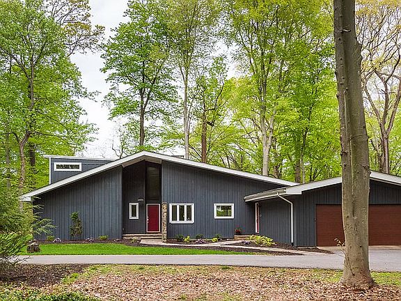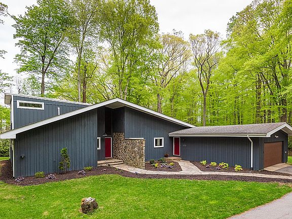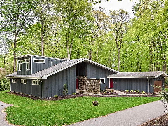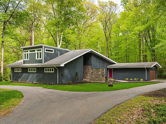 Remarkable mid-century modern home just outside West Chester on 1.9 secluded acres. This 4 bedroom, 3.5 bath 2,800 sq ft home blends inside and outside living with open sight lines & expanses of glass that bring the outside in. The main level living area boasts soaring ceilings, sliding glass doors, stone flooring, an over-sized fireplace, and stone walls in all the right places. The newly remodeled kitchen features hardwood floors, a Wolf range, quartz countertops and frameless cabinets. A separate dining room with stone floors and built in cabinets evoke the design of Frank Lloyd Wright. 3 bedrooms and 2.5 remodeled baths finish out a private bedroom wing on the main level. Upstairs features a large multi-purpose room that can be used as a master bedroom or another family room and includes a fireplace, full renovated bath, and lots of natural light. An over-sized garage and shed provide plenty of storage space. Outside, a level lot, a private circular driveway, and an adjacent neighborhood offers the perfect balance of privacy and community, a rarity for contemporary homes. New 2015 high efficiency mini-splits and pellet stove, 2017 hot water heater, 2016 electric and generator sub panels and in-ceiling/wall surround sound are just a few of the recent upgrades. Come experience how this updated mid-century mixes function, comfort, and style.