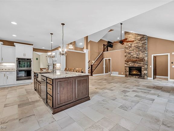 - Description: Lower Level Rec Room with epoxy flooring, Multi-Area Recessed Lighting, Wet Bar with Pendant Lighting and Built In Cabinets and Stone Fireplace with Mantel from Trees on Property.,Flooring: Tile