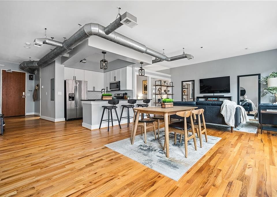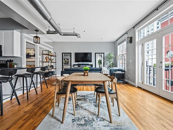 Experience the best of city living in this beautifully updated open-concept condo in the heart of Midtown! The modern kitchen features white shaker cabinets, stone countertops, stainless steel appliances, and a breakfast bar for casual dining. The dining area opens to a Juliette balcony through French doors, filling the space with natural light and offering an easy flow into the spacious living room. Gorgeous hardwood floors run throughout, adding warmth and style.    The primary suite boasts a spa-like en-suite bath and a large walk-in closet, while a stackable washer/dryer adds everyday convenience.    Relax or entertain on the updated rooftop deck with stunning views of the Midtown skyline, complete with a gas grill and seating area. Additional highlights include an assigned parking space in the secure gated garage and unbeatable proximity to all Midtown has to offer—Piedmont Park right in your backyard, The High Museum, Colony Square, Marta, and local favorites like Flying Biscuit and Caribou Coffee.    Move-in ready and perfectly located, this condo combines comfort, convenience, and vibrant city living!