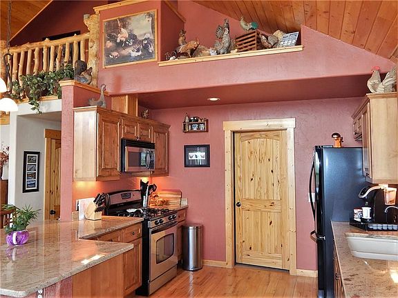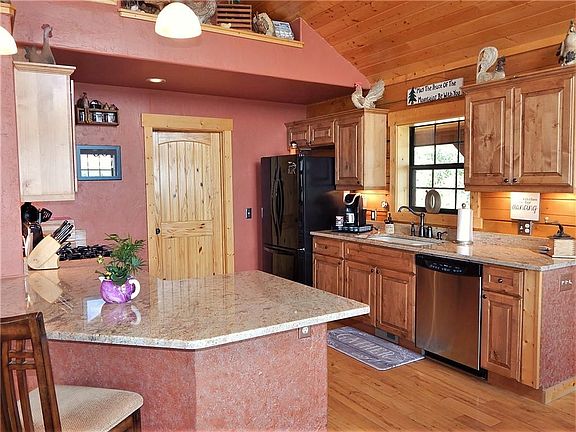 Fully furnished log cabin getaway has AMAZING VIEWS & an OS 2 car garage. Knotty alder cabinets, granite countertops, under cabinet lighting, SS appliances, natural gas range, log interior accents, T&G vaulted ceiling, knotty pine doors throughout, hardwood floor, beautiful vintage look pellet stove, walk-in closets and a jetted tub. INCREDIBLE 2 story moss rock fireplace with split log mantel and stone hearth. Outside features a HUGE wraparound deck that is covered on 2 sides & a circle drive.