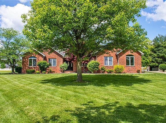 Gorgeous custom full brick ranch situated on pristine 2.47 acre lot in O'Fallon school district! Flat park like backyard, incredible pool house with veranda overlooking the perfect pool oasis! Double slides & diving board, plenty of room to play here! Immaculate home, new flooring throughout including freshly finished hardwoods! Open dining/living space, french door front office, huge family room with picture perfect views & a bricked heat n glo fireplace. Gourmet kitchen w butterfly peninsula, beautiful wood cabinetry, stone backsplash inlay, & new dark stainless appliances. Master suite w spectacular walk in tiled shower. Two additional bedrooms, full bath, and garage entry half bath with bonus shower in laundry room. Enjoy nights entertaining on the veranda- wired for speaker system & outdoor tv! Bar fridge, half bath and pool storage in pool house. Situated in the county- outbuildings allowed! Just blocks from Sports Park, biking trail, easy access to base and 64! Don't miss this!