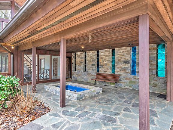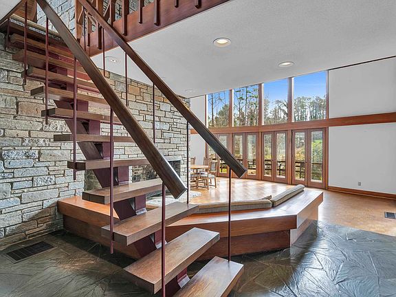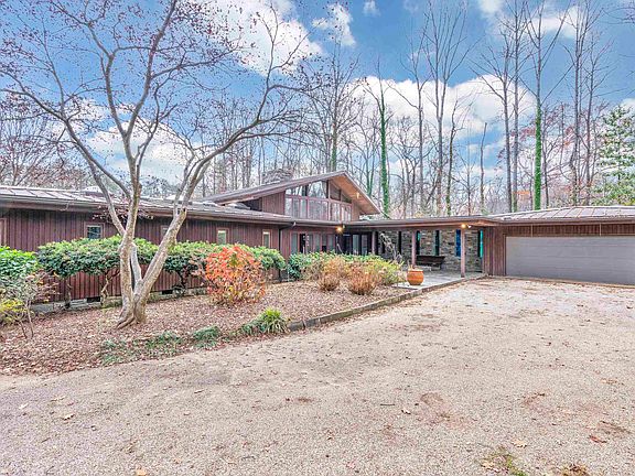This 1960's home was inspired by the work of Frank Lloyd Wright along with influences from the architect’s love of Swiss style Chalets. The main floor features 4 bedrooms (including a master suite with a full bathroom). Another bedroom includes a private bathroom with the other 2 bedrooms sharing a hall bath. A Contemporary design creates flow around a central kitchen with eat-in space and the dining area. The living room has a large stone, wood-burning fireplace with cozy seating. Upstairs you will find more living space in the loft style area and includes built-in bookshelves, a second wood-burning fireplace and extra with storage access. The lower level features the 5th bedroom with an attached full bathroom. Also included is a small kitchenette. A 3rd stone built, wood-burning fireplace enhances the lower-level living room with added storage space and access to outside. There’s even a workroom, which was previously used as a photography dark room, and a utility room. Exterior features a wraparound deck and screened porch on the front of the property. The rear entry off the driveway includes a water feature and patio area. Large garage was converted to a workshop but can easily be changed back.