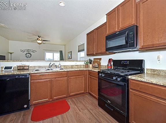 Beautiful and well kept three bedroom, two bath, two car garage in the Lorson Ranch subdivision! Close to Fort Carson, shopping, dining and I-25. This ranch plan is open and bright with a large kitchen, gas range, black appliances and a pantry. Ample sized dining room / flex room. The living room is located at the rear of the home with a walk-out to the fenced backyard. Large master suite with an attached full bath and walk-in closet. Central air conditioning, all rooms are wired for ceiling fans, fully landscaped with sprinkler system. Move in ready!
